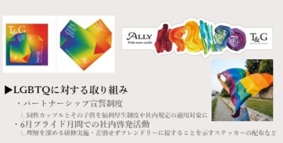 T&Gの取り組みでのキーワードは「Friendly」と「Ally」です。Friendlyは友好的。Allyは味方‧助けるという意味があります。大手の企業などはAllyを強制的に推進する事が多くあるとの事ですがT&GではFriendlyでもAllyでも、どのスタンスを取るかはその人の自由だとおっしゃっていました。「思う、考える、興味を持つそれ自体がAllyへの一歩」ともおっしゃっていました。