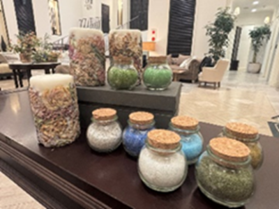 その中でも、廃棄物回収とCO2排出削減の取り組みが印象的でした。例えば、コロナ禍に使用したアクリルパーテーションや不要となったグラスなどを回収し、コースターやサンドアートの材料にアップサイクルを行いました。この取り組みは式場のスタッフからの提言がきっかけだったそうですが、 2024年の廃棄物回収量は約18.9トン、CO2排出削減量は6.4トンと、環境負荷の軽減に貢献しています。アップサイクルされてできたコースターやキーホルダーが 「おしゃれ」で「ワクワクする」デザインであることも、サステナブルな取り組みを広げていくうえで大切なポイントだということも教えていただきました。